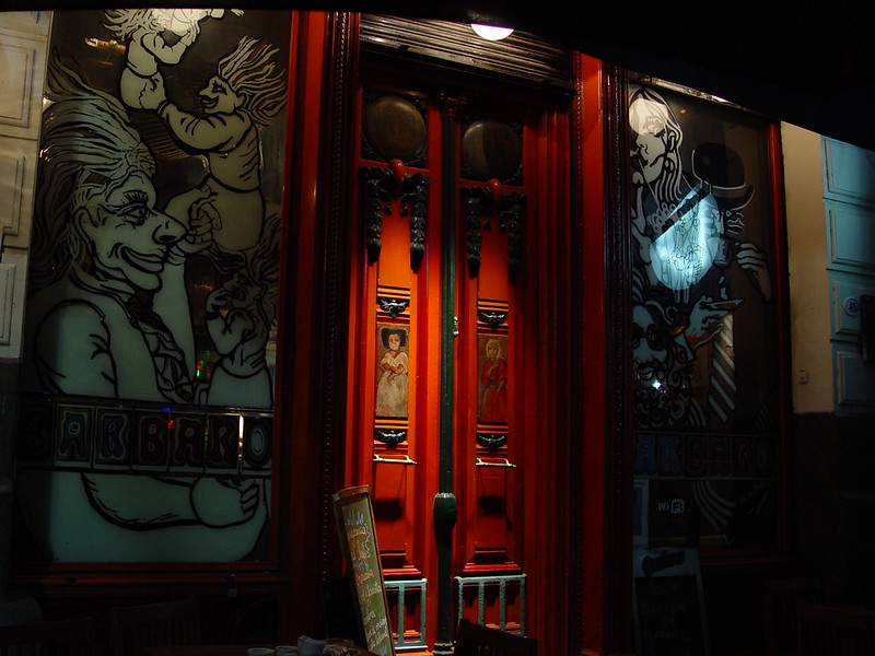 Los vidrios de la fachada fueron pintados por Jorge de la Vega: allí se lucen varios rostros en blanco y negro, en donde quedó reflejada la impronta de este arquitecto, cantautor y pintor del paisaje urbano porteño.